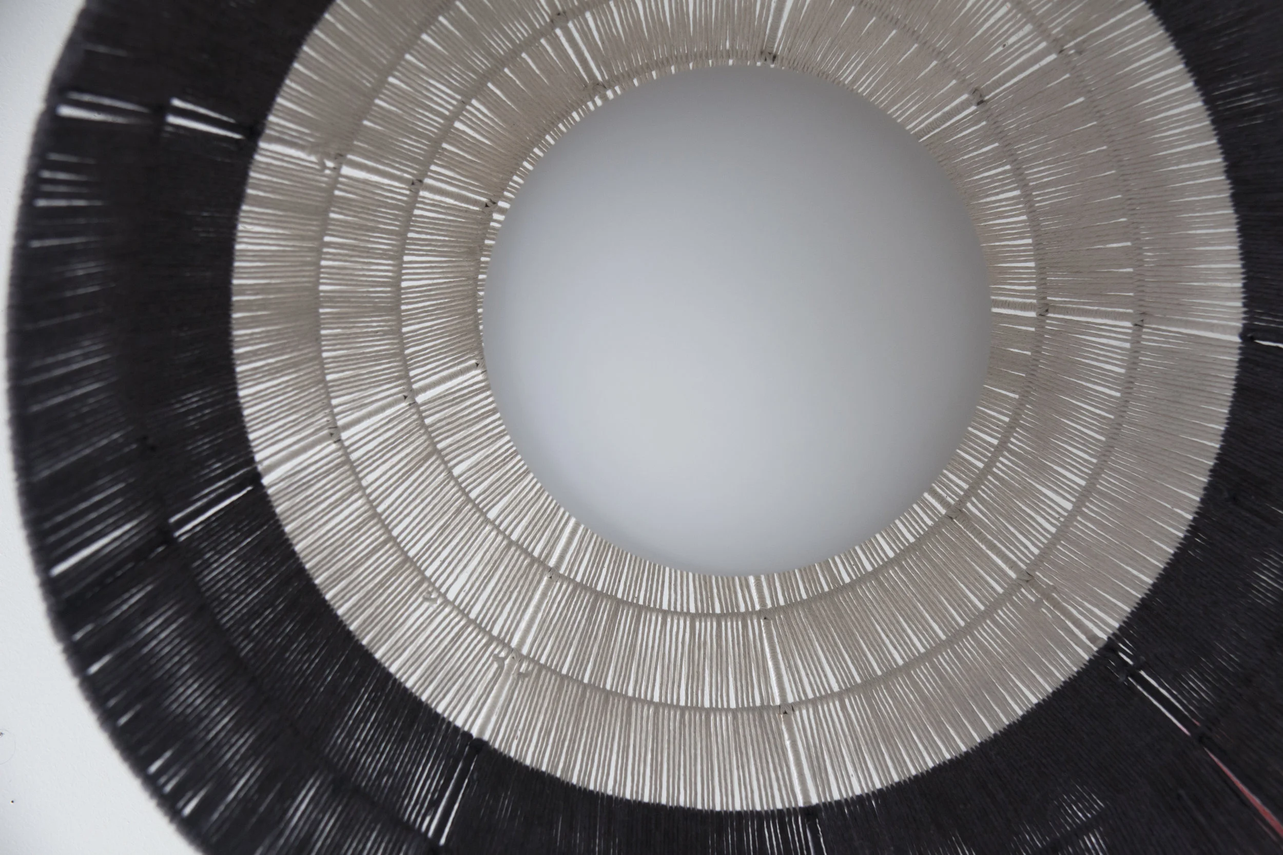 Dome with cap frame hand wrapped in natural string and dip dyed to achieve a horizon line that is lit within by a frosted globe bulb. Suspended from dyed and braided rope. Color options are shown here